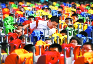 在二十七中和奮斗小學(xué)的表演團(tuán)隊(duì)都有替補(bǔ)隊(duì)員。“哪個(gè)坐標(biāo)點(diǎn)缺人了,他們就會(huì)立刻補(bǔ)上去,所以說他們要組的字和圖案比較多,可以說每一個(gè)動(dòng)作都要會(huì)!边@些替補(bǔ)隊(duì)員在不上場(chǎng)的時(shí)候,還要在隊(duì)列之間進(jìn)行巡視,查看道具,提醒同學(xué)做動(dòng)作。另外修道具也是他們的一項(xiàng)重要工作,為此表演的同學(xué)們都叫這些替補(bǔ)隊(duì)員為“小師傅”。