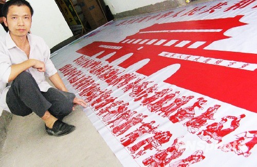 二十四日,記者看到,該剪紙長約十米,寬兩米,以紅白兩色為主,線條活潑流暢,人物形態(tài)逼真。剪紙上方為“熱烈慶祝中華人民共和國成立六十周年”十七個大字;中間接紅色天安門城樓,顯得巍峨壯觀;再往下是天安門廣場,五十六個民族的代表分兩行排列,身著獨具民族特色的服飾,或歡歌或舞蹈,五十六個民族團結一致、喜迎國慶之情躍然于紙上。