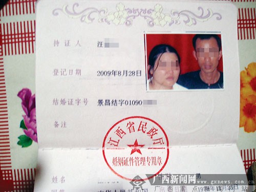 隨后,兩人帶來(lái)了一個(gè)年輕女子。從女子出具的身份證和戶口本上得知,她叫張×蘭,廣西賓陽(yáng)人,今年28歲。見(jiàn)該女子模樣不錯(cuò),汪家心生喜歡。8月28日,汪先生支付了幾千元介紹費(fèi)給中間人后,和張×蘭到當(dāng)?shù)鼗橐龅怯洐C(jī)關(guān)進(jìn)行了登記。