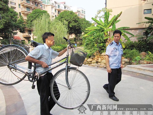 9月26日下午,一名小偷在(廣西)南寧市大學(xué)路嘉慧馨源小區(qū)偷得一輛自行車,準(zhǔn)備推車離開時(shí),卻遇到了車主——該小區(qū)的一名保安。車主抓住小偷后,讓其扛車在小區(qū)示眾。