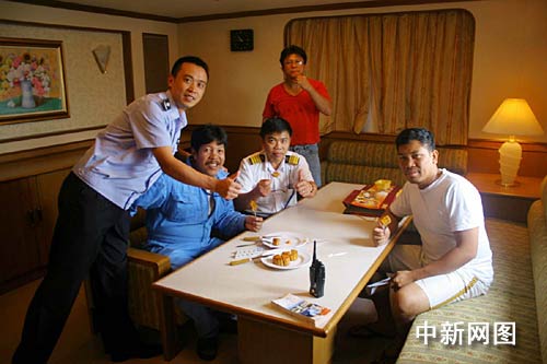 “趕快讓大家都過來,有月餅吃。”船長告訴助手,十幾個船員陸陸續(xù)續(xù)來到船長辦公室,狹小的船艙一下子熱鬧起來。“Give me one.”(給我一塊。)“It’s delicious.”(真好吃。)