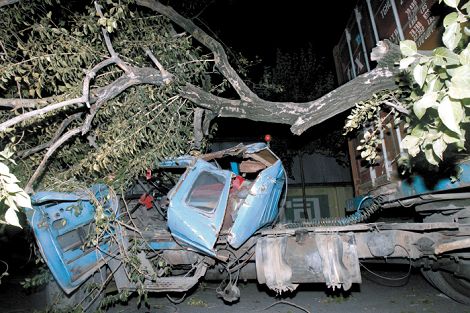 一旁,一個樹杈壓在貨車駕駛室上,使其嚴重變形,風擋玻璃全部破碎。一棵直徑約0.8米的大樹倒在人行道上,樹根部已經(jīng)腐爛,樹冠將馬路占去了四分之三。