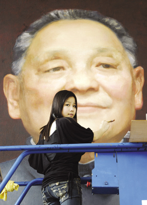 1日上午,新中國成立60周年慶祝大會在北京天安門廣場及長安街沿線舉行。當游行隊伍簇擁著新中國4位不同時代領(lǐng)導人毛澤東、鄧小平、江澤民和胡錦濤的巨幅畫像走過天安門廣場時,4位領(lǐng)袖的原音首次在廣場上先后重現(xiàn),象征著新中國發(fā)展歷程中4座偉大的里程碑,令全國觀眾印象深刻。當“春天的故事”方陣簇擁著的改革開放總設(shè)計師鄧小平巨幅畫像經(jīng)過天安門廣場時,站在天安門廣場上一位1988年出生的南京女孩特別激動,因為她參與繪制了這幅6米高、5米寬的肖像油畫。她的名字叫周末,中央美院的學生。
