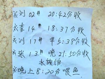 由于年齡大了,記不住那么多時間,于是每星期日兒子返校前就會給于女士寫一張時間表,里面有收菜的時間、喂魚食的時間、還有上別的同學地里偷菜的時間,以方便于女士操作。