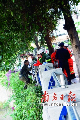 昨天(4日)上午,廣州體育學(xué)院一名學(xué)生抓到一名偷電腦的小偷,不料小偷在被押往警務(wù)室的途中,掙脫保安跳入沙河涌并躲進(jìn)排污口兩個(gè)多小時(shí)。據(jù)抓獲小偷的保安介紹,小偷跳入河中后,路過(guò)的同學(xué)見(jiàn)了,紛紛拿東西砸向小偷,小偷叫囂道:“再砸就把你們宿舍偷光!”