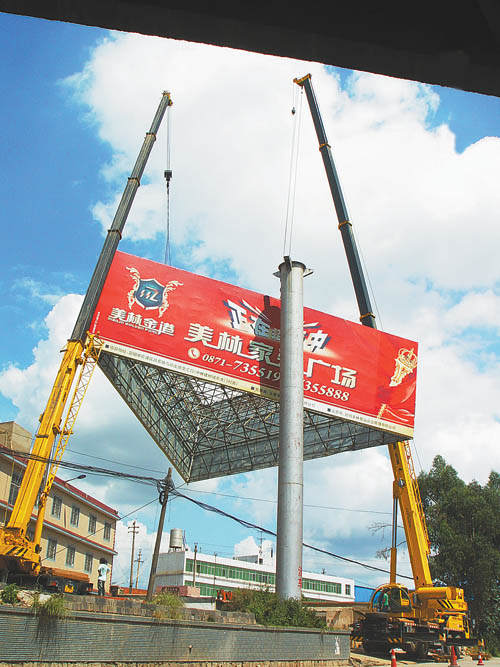 9月18日,記者在昆明國(guó)際會(huì)展中心附近看到,兩棵單立柱廣告牌正在被大吊車吊起。隨后幾天,記者在昆明的城南、城北地區(qū)都看到有關(guān)部門(mén)在拆除戶外廣告牌。記者從昆明市城管局獲悉,截至9月24日,昆明市主城區(qū)共拆除單立柱200棵。其中,五華區(qū)、高新區(qū)、度假區(qū)、呈貢已提前完成拆除任務(wù)。盤(pán)龍區(qū)、經(jīng)濟(jì)技術(shù)開(kāi)發(fā)區(qū)也開(kāi)始拆除高等級(jí)道路兩側(cè)的單立柱廣告。在昆明當(dāng)?shù),剩余的單立柱廣告已經(jīng)屈指可數(shù)。