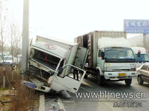 今日10時許,在哈市哈平路農(nóng)機研究院路段,一輛白色廂式貨車行駛中前方車輛突然減速,貨車剎車不及只能轉(zhuǎn)向躲避,沖上路面的隔離帶撞到一根鐵柱方才停下。貨車駕駛室嚴(yán)重變形,破碎的風(fēng)擋玻璃和機器零件散落一地,司機大腿被卡住。
