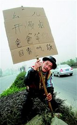 往常,這個狹小的路口并未引起過往駕駛員的注意。昨日,當兩塊相同的雷人交通警示牌立于道路中央隔離欄后,引起了部分駕駛員關(guān)注。警示牌是分別用兩塊約1平方米的紙板做的,上面用毛筆彎彎曲曲地寫著:“幺兒,開慢點,爸爸等你回家吃飯!”