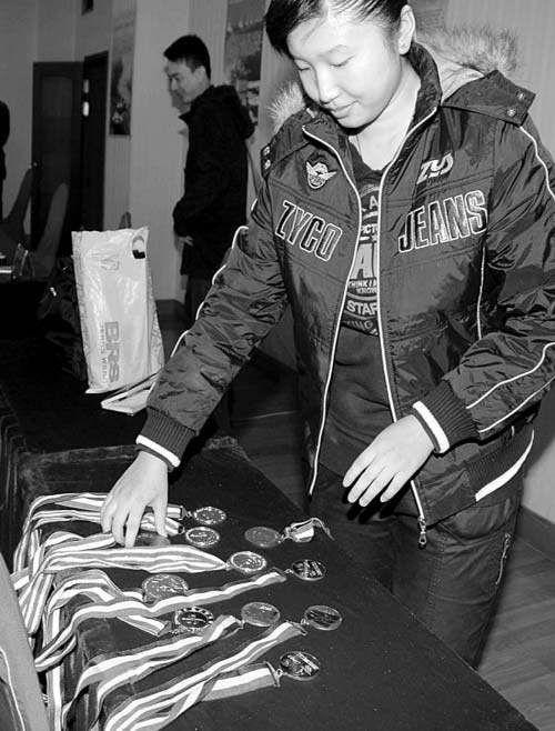 這位叫曹莉燁的女孩告訴記者,自己7歲習(xí)武,畢業(yè)后一直參加集訓(xùn)和比賽,因此才在畢業(yè)的第二年來報名。當(dāng)記者詢問她曾參加過什么比賽時,她拿出了十多塊金牌。