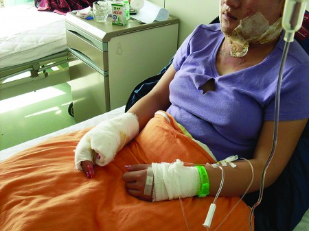 在濱州醫(yī)學院附屬醫(yī)院,記者看到,張青臉上被厚厚的紗布包裹著,有的部位還滲出了組織液,未包扎的耳部已經(jīng)紅腫出膿,看了讓人揪心,守護在新娘子旁邊的母親不時傷心落淚,新郎也愁眉不展。