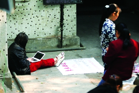 前日,網(wǎng)友“壞豬”在大渝網(wǎng)新聞報料吧上,以《史上最拉風(fēng) 收廢品女》為名發(fā)帖報料!皦呢i”在帖子中稱,前日上午,他剛好從該居民樓前經(jīng)過時,隱約看到樓梯口有一黑影,轉(zhuǎn)頭查看,眼前的景象將他雷得“外焦內(nèi)嫩”:一身穿黑衣的女子,背靠墻壁席地而坐,身前放著一個寫有“專業(yè)回收”的廣告布,她對過往市民毫不理會,而是專心敲打放在其大腿上的筆記本電腦!拔疫從來沒看到過哪個收廢品的有這個女的這么潮!太拉風(fēng)了噻”。
