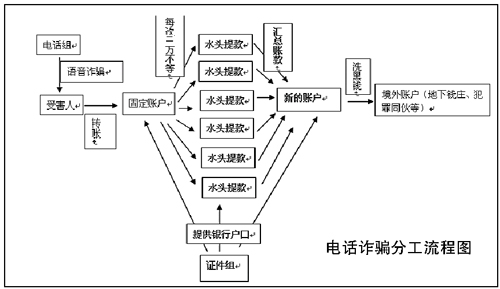 專案組確定該案是一個(gè)以境外人員為首的組織嚴(yán)密的犯罪團(tuán)伙所為。該團(tuán)伙通過網(wǎng)絡(luò)電話撥打事主電話,以事主家庭電話欠費(fèi)、銀行賬號涉嫌違法等為借口,騙取事主將賬戶內(nèi)的錢轉(zhuǎn)賬或提取現(xiàn)金后存入團(tuán)伙成員提供的“安全賬戶”內(nèi),并通過頻繁轉(zhuǎn)賬將賬戶內(nèi)的大額存款分散到多個(gè)賬戶內(nèi),其他成員則在全國各地分別提取現(xiàn)金。