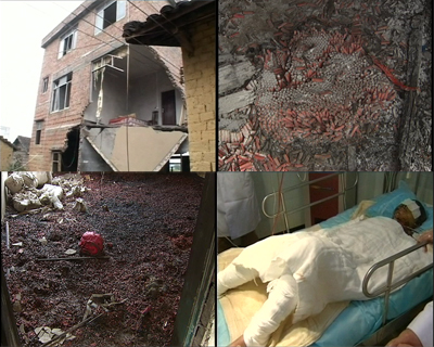 記者:“在這個(gè)事故現(xiàn)場(chǎng),我們也可以看到這里已經(jīng)是一片狼藉,這個(gè)樓馬上已經(jīng)要塌陷了,這個(gè)地上到處布滿了炮筒,這些應(yīng)該是一盤已經(jīng)裝好火藥的煙花,這里我們看到滿地都是炮筒,這個(gè)房間正是布滿了整整一層的炮筒,在現(xiàn)場(chǎng)我們注意到有這樣一口鐘,我注意到時(shí)針指得是7點(diǎn)46分,也就是說(shuō)這口鐘將永遠(yuǎn)將定格在11月12日7點(diǎn)46分事故發(fā)生的那個(gè)時(shí)間。”