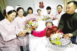 女子叫蔣翠,今年38歲。男人叫張兵,今年44歲。張兵推著妻子,輪椅軋過紅地毯,迎著空中的花瓣,進入病房。“祝福你們,你們讓我們懂得了攜手到老的承諾!贬t(yī)生護士共同祝賀夫妻倆,希望他們“新婚”快樂?粗贾贸尚路康牟》,蔣翠哭出了聲音!跋M銈兡軋猿窒氯ィ鲪塾肋h。”武警總隊醫(yī)院醫(yī)務(wù)處主任向貴平擔(dān)當(dāng)起了主婚人的職務(wù),向夫妻頒發(fā)了結(jié)婚證。這張結(jié)婚證也傾注了醫(yī)院醫(yī)生護士的心血。通過和南岸區(qū)民政局聯(lián)系、溝通,婚姻登記處工作人員特地到病房,為蔣翠辦理了結(jié)婚證。