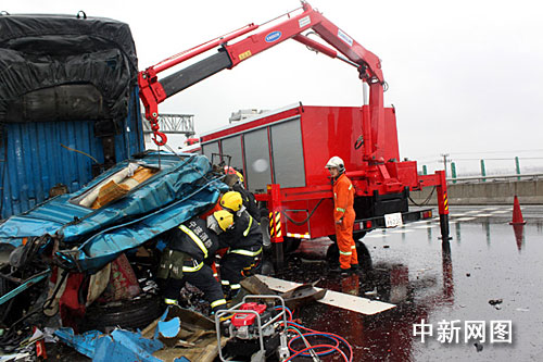 今天早上8時許,高速寧波支隊指揮中心接到報警稱在繞城高速姜山北互通附近有兩車追尾,有人受傷,且傷勢較重。接警后,四大隊巡邏民警立即趕赴現(xiàn)場。到達事故現(xiàn)場后,民警發(fā)現(xiàn)肇事的是蘇FU3033車牌號重型廂式貨車和閩A15387號重型廂式貨車。其中后車閩A15387號大貨車駕駛室已經(jīng)嚴(yán)重變形,駕駛室在碰撞后,被擠壓成厚度不足1米的“鐵餅”。透過碰撞的殘骸可以隱約看到有兩人被困車內(nèi),氣息十分微弱,F(xiàn)場民警在展開施救同時,立即要求增援。8時26分,鄞州消防大隊接到指令后立即出動1輛搶險救援車、7名消防官兵趕赴現(xiàn)場。