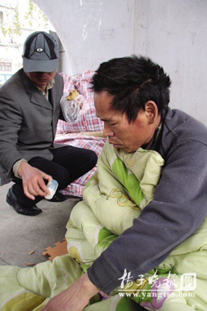 記者隨后來到“大傻”所睡的位置,發(fā)現(xiàn)這位綽號“大傻”的民工并沒有睡著,見到記者也是兩眼迷茫,后來他告訴記者,自己名叫王震學(xué),今年46歲,安徽阜陽人,父母過世,只剩下自己孤身一人在外打工求生活,由于腿疼、肺部也有毛病,所以干不了重活,20天前得了重感冒,一直以來發(fā)燒不止,后來是一位在附近賣烤紅薯的老師傅給他買了一瓶安乃近。和王震學(xué)睡在一起的小湯說,王震學(xué)已經(jīng)20多天沒有起過床,這幾天也是基本吃不下飯,我真怕再不將他送進(jìn)醫(yī)院,他也只有等死了。
