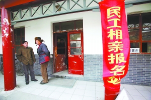 今天上午9時許,略顯冷清的望京公園里,幾條帶著相親標語的紅色橫幅旁,時不時會有幾個晨練者走過。民工相親會的組織者們在公園管理處的辦公室里靜待相親者。盡管此后的一小時里,先后有10余名相親者魚貫而入,但令人擔心的一幕還是發(fā)生了,前來相親的基本都是男性。