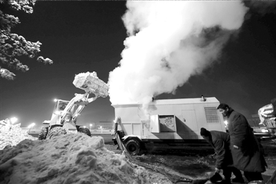 昨天凌晨,在人民大會堂東側(cè)路,環(huán)衛(wèi)集團(tuán)的新武器“融雪屋”正在進(jìn)行“吃雪”作業(yè)。鏟車每隔幾分鐘就向“融雪屋”內(nèi)倒入一鏟積雪,隨著一陣白色霧氣升起,積雪就被融雪屋“吃”掉,變成水流進(jìn)了市政管線。從外表看,“融雪屋”就是一個橘黃色的方形體。負(fù)責(zé)操作的高師傅說,不要小瞧這個機(jī)器,它每小時能融雪25噸!跋襁@樣低的溫度,即使融雪劑與積雪充分混合,靠自然溫度融化減量也有一定困難,所以我們投入使用了這個新設(shè)備,加快積雪融化。”北京環(huán)衛(wèi)集團(tuán)作業(yè)部部長張志強(qiáng)說!