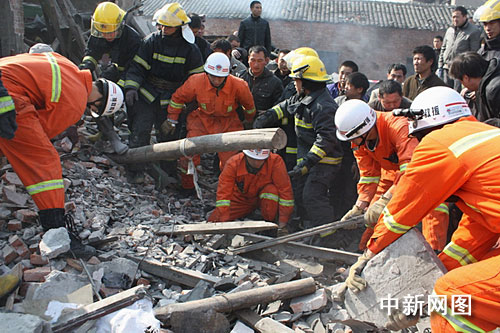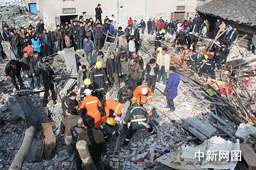 當(dāng)日下午13時14分,瑞安市消防大隊接到報警后,迅速調(diào)集公安現(xiàn)役消防隊及專職消防隊6輛消防車30名指戰(zhàn)員趕到現(xiàn)場實施救援。消防官兵到達(dá)現(xiàn)場時,現(xiàn)場一片狼藉,百余平方米的房屋已成為廢墟,現(xiàn)場嘈雜聲混成一片,爆炸現(xiàn)場多處起火,火魔開始向倒塌民房蔓延,而廢墟下面有多條生命等待著救援,現(xiàn)場情況十分危急。消防官兵立即出兩支高壓水槍對火勢進(jìn)行控制,同時救援小組迅速展開營救。