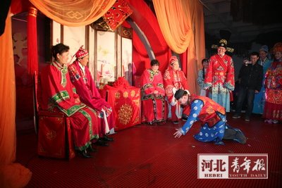 新娘孫蓓說:“現(xiàn)在,人們對(duì)傳統(tǒng)的東西都淡化了,我們希望通過自己的行動(dòng)喚起更多人對(duì)傳統(tǒng)文化的興趣!
