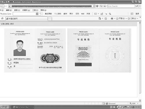 盡管公開信息顯示,石家莊市裕華區(qū)人民法院已于2009年9月對(duì)蔡國海作出了有期徒刑3年緩刑5年的判決,但2010年1月26日,記者還是在中國記者網(wǎng)的“記者證查驗(yàn)系統(tǒng)”中找到了蔡國海的名字。查詢結(jié)果顯示,蔡國海的記者證辦證日期為2009年8月,并通過了這一年的年度核驗(yàn)。在中國記者網(wǎng)“新聞機(jī)構(gòu)”查詢系統(tǒng)中,蔡國海仍是《消費(fèi)日?qǐng)?bào)》河北記者站的記者。