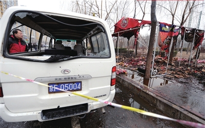 事發(fā)后,豐臺警方立即趕到現(xiàn)場。大紅門、右安門兩支消防隊9輛消防車到場救援。6點15分左右,現(xiàn)場大火被基本撲滅。昨天上午7點,記者在現(xiàn)場看到,地上布滿了煙花殘屑,20多平米的煙花大棚只剩下支撐的鐵架子,棚內(nèi)存放的煙花和遮棚布全被燒光。福田面包車的車窗玻璃被炸碎,車內(nèi)一片狼藉。周圍多輛轎車被波及,有一輛車的輪胎外側(cè)金屬圈被炸飛,多輛車的車身被炸花。