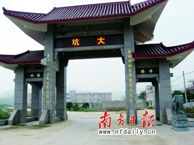 大坑村是一個(gè)偏遠(yuǎn)的革命老區(qū)村。從鎮(zhèn)場輾轉(zhuǎn)乘車幾公里,遠(yuǎn)遠(yuǎn)可見青瓦大理石牌坊高聳于村口,上面紙貼的“大坑”二字顯得粗糙而扎眼。