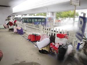 市場關(guān)門放假之后,那些滯留在門口的民工只好收拾好行囊,和其他工友聯(lián)系住處。一位安徽籍民工告訴記者,他和其他幾個老鄉(xiāng)準(zhǔn)備去另一個老鄉(xiāng)打工的工地那里暫時住兩天。放假了工地也停工,但是住的地方還是有的。而還有一些民工索性又將行李搬到了安德門地鐵站附近的高架橋下,“現(xiàn)在工作也不好找,住旅館實在太貴,我們只好再住回高架橋下。”民工們搬進高架橋下后,個個哀聲嘆氣,但也有一些情緒樂觀的,跑進了地鐵站內(nèi)打撲克取暖消遣。(記者 曹盧杰 裴睿)