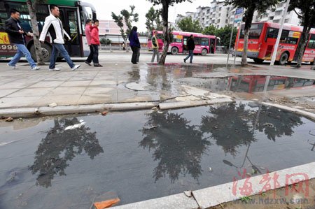 昨天下午,記者在現場看到,水坑大約有十幾平方米,隱隱有酸臭味撲面而來!斑@幾天剛下過雨,氣味已經好了很多!睒I(yè)主周先生 說,年前氣溫高的那兩三天,臭味能熏到三四十米開外的樓層,許多住戶大熱天不敢開窗。記者注意到,這個水坑正好位于108公交車的終點站,距離站牌不過三四米。因此,附近居民等車時,不得不挨著水坑,碰到上下班高峰期,常有人被擠到坑里,弄得一身酸臭。