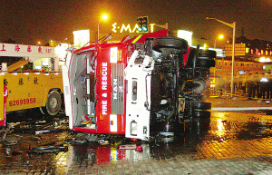 昨天(19日)下午5時(shí)15分許,(上海)浦東御橋路浦三路口處發(fā)生意外,一輛消防車與一小轎車在行駛中發(fā)生碰撞,消防車在沖倒路邊的欄桿和燈柱后側(cè)翻在地,小汽車則被反向甩出近20米遠(yuǎn),車內(nèi)一名新婚女子和一3月大的男嬰身受重傷,情勢危急,另有十余人輕傷。