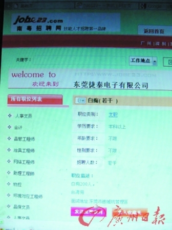 昨日,有讀者向記者報(bào)料,在一家知名招聘網(wǎng)上,一家名為“東莞捷泰電子有限公司”的企業(yè),發(fā)布了一則招聘信息,聲稱招聘“白癡”和“人妖”。
