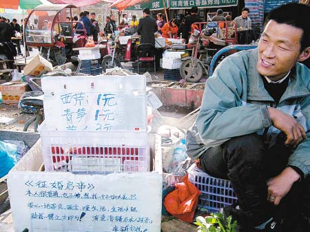“我的條件一般,找個和我合適、能過日子的就行”,對于心中的另一半,余東陽的想法很本分,“具體的啟事上都寫著呢,您先自己看看”,嘴里說著話,眼睛卻沒閑,和記者聊天時,余東陽看到有人買菜,趕快又做起了生意。周圍賣菜的人告訴記者,余東陽做生意很勤快,也能吃苦,每天早上6點就準時從批發(fā)市場把菜運來,還經(jīng)常幫旁邊的人占攤位,晚上一般不到8點,就能把菜賣完,平均一天收入100元左右。而在與余東陽的聊天中,他告訴記者自己平時看營銷類的書,他相信自己將來還會做更有前途的生意。
