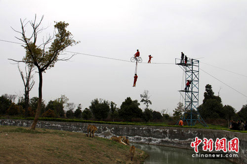 “小燕子”迅速調(diào)整姿勢、繼續(xù)前進(jìn),剛剛十步開外,最驚險(xiǎn)的一幕出現(xiàn)了,園中的老虎似受到現(xiàn)場緊張氣氛的影響,突然顯得有些躁動(dòng)不安,在鋼絲繩下來回走動(dòng),并警覺的看著上方的挑戰(zhàn)者“小燕子”,驚天動(dòng)地般地呼嘯了兩聲后,成年公虎“阿彪”向著“小燕子”所在的上方跳去,差點(diǎn)碰到位于鋼絲下方領(lǐng)路的自行車扶梯上。同時(shí),一只母虎試圖爬到附近的大樹上。“小燕子”一度陷入了老虎觸爪可及的危險(xiǎn)境地,實(shí)在是讓現(xiàn)場觀眾為她捏了一把冷汗。鋼絲上,命懸一線的“小燕子”,在空中搖晃了幾下,停下來凝神吸氣,盡力控制住鋼絲不再晃動(dòng),一步一步向鋼絲另一端走去。終于,“小燕子”耗時(shí)近20分鐘,成功的完成挑戰(zhàn),一舉突破50米,創(chuàng)造了自己新的紀(jì)錄,爾后空手走到自行車前“凱旋”,觀眾忍不住拍手叫絕。