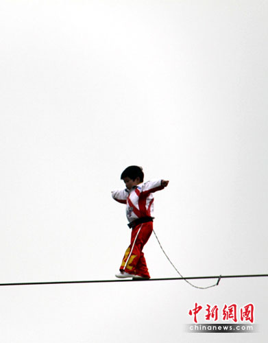 今日此間,“小燕子”在同門師哥表演過“自行車空中花樣表演”后,不足1米高的她站在10米高臺上。在眾人期待下,“小燕子”謹(jǐn)慎的邁出了第一步,眾人的心一下子提到了嗓子眼!果不其然,自行車“開道”后,在鋼絲上剛剛邁出兩步的“小燕子”就被迫來了個(gè)“金雞獨(dú)立”,花了4秒鐘時(shí)間揮舞雙手才得以保持平衡。