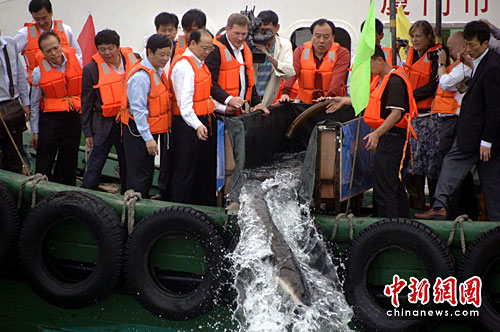 中新社廈門4月22日電 (記者 陳悅)22日下午,廈門在九龍江雞嶼海域放流108尾有“魚類活化石”之稱的中華鱘。其中四只在海洋公園保育基金贊助下,首度配上“衛(wèi)星追蹤信標”,相關專家表示,這將是中華鱘研究及保育的一大突破,將開展有效保育中華鱘新的一頁。