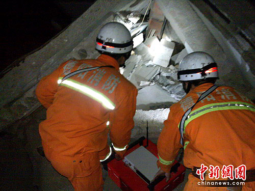 4月15日,玉樹縣結(jié)古鎮(zhèn)氣象賓館旁的民房,肖國平和白云飛的視頻生命探測儀發(fā)揮了作用。據(jù)群眾反應(yīng),這里有被埋人員,肖國平與白云飛立即就沖了上去。這幢民房整體坍塌,他們在廢墟里仔細(xì)探尋,殘垣斷壁露出的鐵釘、鋼筋、瓦礫讓他們行動困難,臉劃破了全然不顧。然而一分一秒過去了,儀器上遲遲沒有發(fā)現(xiàn)生命跡象,但他們沒有放棄,繼續(xù)將視頻探頭深入廢墟中,最終在一個倒塌的墻體下發(fā)現(xiàn)疑似人體的跡象。