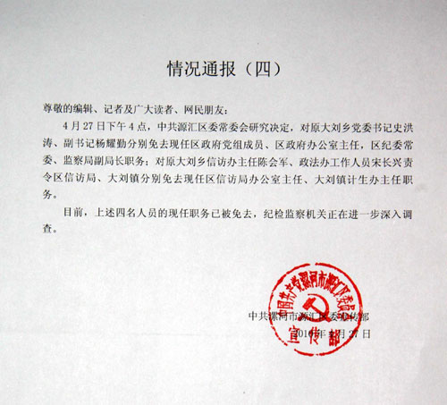 27日,漯河市源匯區(qū)委宣傳部通報(bào)說(shuō),中共源匯區(qū)委常委會(huì)研究決定,對(duì)原大劉鄉(xiāng)黨委書(shū)記史洪濤、副書(shū)記楊耀勤分別免去現(xiàn)任區(qū)政府黨組成員、區(qū)政府辦公室主任,區(qū)紀(jì)委常委、監(jiān)察局副局長(zhǎng)職務(wù);對(duì)原大劉鄉(xiāng)信訪辦主任陳會(huì)軍、政法辦工作人員宋長(zhǎng)興責(zé)令區(qū)信訪局、大劉鎮(zhèn)分別免去現(xiàn)任區(qū)信訪局辦公室主任、大劉鎮(zhèn)計(jì)生辦主任職務(wù)。目前,上述四名人員的現(xiàn)任職務(wù)已被免去。