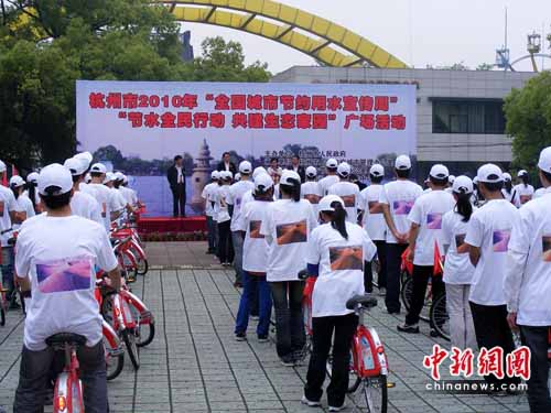 中新網(wǎng)杭州5月15日電(記者 趙曄嬌 實習(xí)生 徐進軍)今天,杭州市“全國城市節(jié)約用水宣傳周”活動在該市少年宮廣場舉行,由近五十名大學(xué)生組成的節(jié)水志愿者車隊騎著公共自行車環(huán)繞西湖,倡導(dǎo)“節(jié)水減排,綠色出行”,提高市民低碳意識。據(jù)悉,杭州水資源緊缺的矛盾日益嚴(yán)峻,僅去年末總蓄水量就較2008年同期減少10.14億立方米,相當(dāng)于減少近100個西湖的水量。