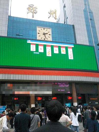 5月16日,鄭州火車站本該顯示車站公告的戶外超大顯示屏上,卻出現(xiàn)了紙牌游戲(見圖),共耗時20來分鐘,游戲過關(guān)后,綠色屏幕上煙花襯著“你贏了”三字。鄭州火車站表示當時打牌的人不是火車站的工作人員,是施工方的。據(jù)瀟湘晨報報道,昨晚,河南本地一公司宣稱對此事負責并致歉。
