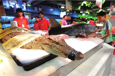 昨天,記者提出看超市出售鱷魚的相關(guān)證明,永輝超市的前臺負(fù)責(zé)人劉先生稱,超市從農(nóng)貿(mào)市場購進(jìn)了鱷魚和鯊魚,對方都提供了檢疫報(bào)告和許可證,“賣方提供相關(guān)證明,我們就能進(jìn)貨公開銷售,超市不需要提供證明”。 (記者王奕)