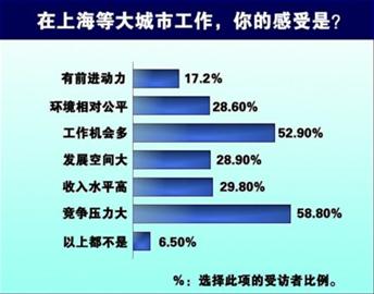 調(diào)查顯示,在上海工作生活多年的受訪者,對這座城市感受最直接的是:競爭壓力大位列第一,達到58.8%;其次是工作機會多,達到52.9%;第三是收入水平高,為29.8%。