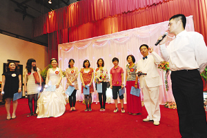 當(dāng)舞臺背景展開“杰出男生11大優(yōu)點(diǎn)”的投影掛屏?xí)r,主持人問女嘉賓喜不喜歡這些優(yōu)點(diǎn)?她們齊聲道:“喜歡!”主持人說:“這就是站在我們面前的這位帥哥身上所具備的優(yōu)點(diǎn)。”這時,主持人問新郎:“什么是最好的男女組合?”新郎答:“男生智慧,女生賢惠!”“請你選出‘心動女生’!”這位新郎臉現(xiàn)真誠,大步走到舉著“賢惠”寫字板、風(fēng)姿綽約的新娘面前,牽住她的手,兩人一起走向臺前,對著來賓大聲說出“愛的誓言”,全場掌聲響起。