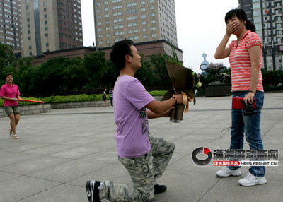 “胡安萱,我好愛好愛你!”70米長的大紅橫幅從象征“幸!钡哪μ燧喩洗瓜,長沙小伙王樂手捧玫瑰單膝下跪向女友求婚:“老婆,嫁給我吧,我們生個兒子讓他早點過兒童節(jié)!”