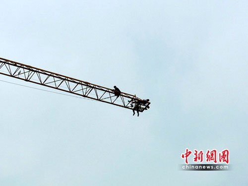 中新網(wǎng)柳州6月3日電(羅海生 黃坤軍)6月3日,廣西柳州市東環(huán)路一在建工地35米高的塔吊頂端,三名農(nóng)民工為了討薪欲跳塔。接警后柳州特勤消防大隊(duì)迅速出動(dòng)一臺(tái)多功能救援車、1臺(tái)53米云梯車,9名官兵趕赴現(xiàn)場救援,經(jīng)過近一個(gè)小時(shí)的勸說三民男子才放棄了輕生的念頭。