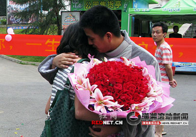 他身后幾位朋友拿著五顏六色的氣球,拉著橫幅,橫幅上寫著——“熊霞輝,我愛你,一生一世呵護(hù)你,嫁給我好嗎?”