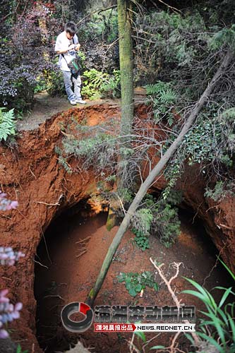 金福喜推測“天坑”產(chǎn)生的過程:數(shù)萬年甚至數(shù)百萬年前,此處地下就存在一個(gè)溶洞。長沙進(jìn)入雨季,地下水位上漲,溶洞內(nèi)空氣被壓縮,向上沖撞土層;停雨時(shí)地下水位下降,洞內(nèi)氣壓降低,土層被向內(nèi)“吸”!斑@里是山坡,水位變化快,溶洞內(nèi)就像有一只打氣筒,對表層土壤的破壞很大。加上外界雨水沖刷,力度達(dá)到一定程度時(shí),土層就垮塌了。”