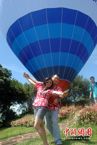 全國的30支熱氣球隊來助興。在?谌f綠園上空漂游的熱氣球上,北京的劉先生突然“變出”一枚鉆戒向女友求婚。他笑著說,從網(wǎng)上看到?诼糜位閼c的消息就瞞著女友報了名,為的是上演在熱氣球上求婚一幕。