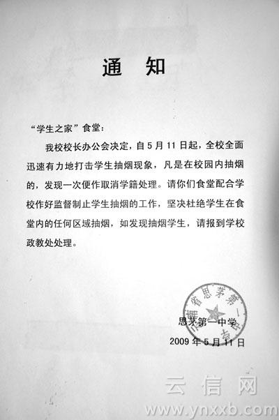 2010年6月1日,普洱市思茅區(qū)教育局向區(qū)屬23所校園發(fā)出《思茅區(qū)教育局關(guān)于在校園內(nèi)公共場(chǎng)所禁煙的通知》(以下簡(jiǎn)稱《通知》)。“這是云南省第一家自發(fā)進(jìn)行控?zé)煿ぷ鞯慕逃龁挝!痹颇鲜〗】到逃責(zé)熮k公室主任趙白帆說。