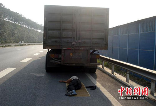 22日上午9時(shí)40分,在連霍高速公路634KM南半幅,記者看到了驚險(xiǎn)一幕:一牌號(hào)為豫HD260掛的大貨車停在應(yīng)急車道上,司機(jī)側(cè)臥于其貨車后酣睡不醒,過(guò)往車輛紛紛繞行。交警了解后得知,劉某因?yàn)榭词澜绫诓拍酶咚俾樊?dāng)床睡。(完)