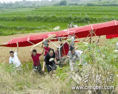 5月10日,武漢東湖開發(fā)區(qū)農(nóng)民舒滿勝,花費10萬元自造土飛機(jī),試飛失敗并受皮外傷。昨日上午,舒滿勝的土飛機(jī)再次試飛,未像上次一樣通知媒體,當(dāng)?shù)夭糠执迕衲繐袅巳^程。據(jù)目擊者胡先生介紹,昨日上午9時許,舒滿勝的土飛機(jī)就被拉到江夏區(qū)五里界鎮(zhèn)醬栗廟路段,在經(jīng)過三四十分鐘的試驗性滑行后,于上午10時準(zhǔn)時起飛。土飛機(jī)“助跑”約200米后,舒滿勝拉動起飛桿,飛機(jī)輪滑輪脫離地面,機(jī)身離地面只有兩三米,飛行不過10米,一頭栽進(jìn)路邊稻田里(如圖),舒滿勝被甩出飛機(jī)左腿受傷。隨后,舒滿勝被送往流芳醫(yī)院。經(jīng)檢查,其左腿髕骨骨折,需手術(shù)治療。